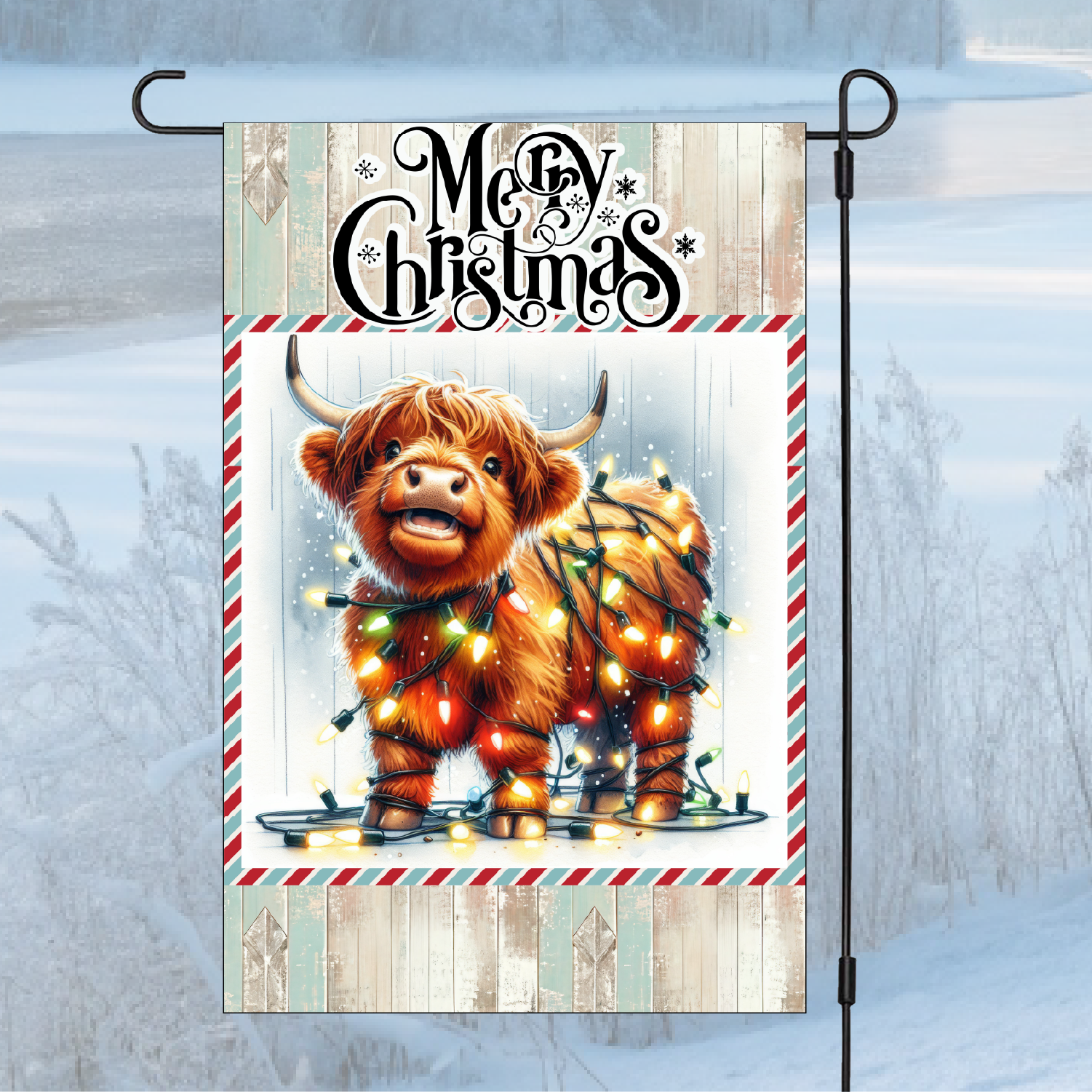 Bring festive fun to your garden with this whimsical flag showcasing a charming Highland cow wrapped up in a tangle of twinkling Christmas lights. Ideal for animal enthusiasts who love a good laugh, this lighthearted design spreads holiday cheer and joy throughout your outdoor space.